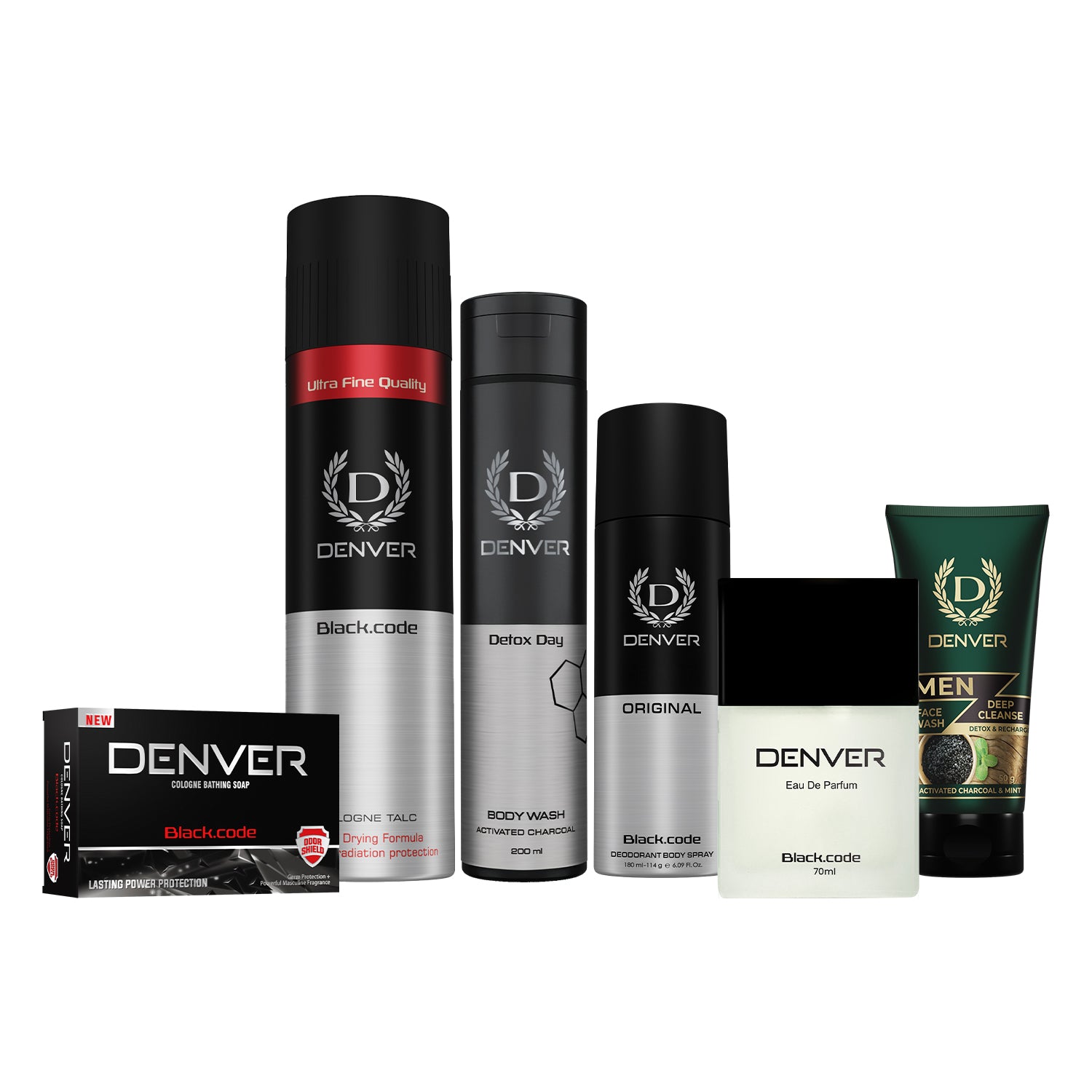 Denver Pack of 6 Black Code Grooming Products (Black code Original Deo 200ml + Black Code Perfume 70ml + Cologne Soap 125g + Black Code Talc 300g + Detox Day Bodywash 200ml + Deep Cleanse 50 gm)