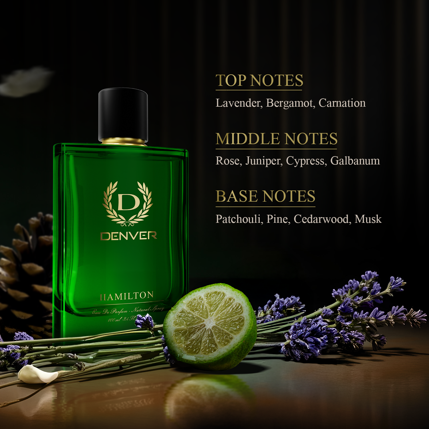 Denver Hamilton perfume has top notes of green, middle notes of spicy floral, and a base of balsamic woody notes.