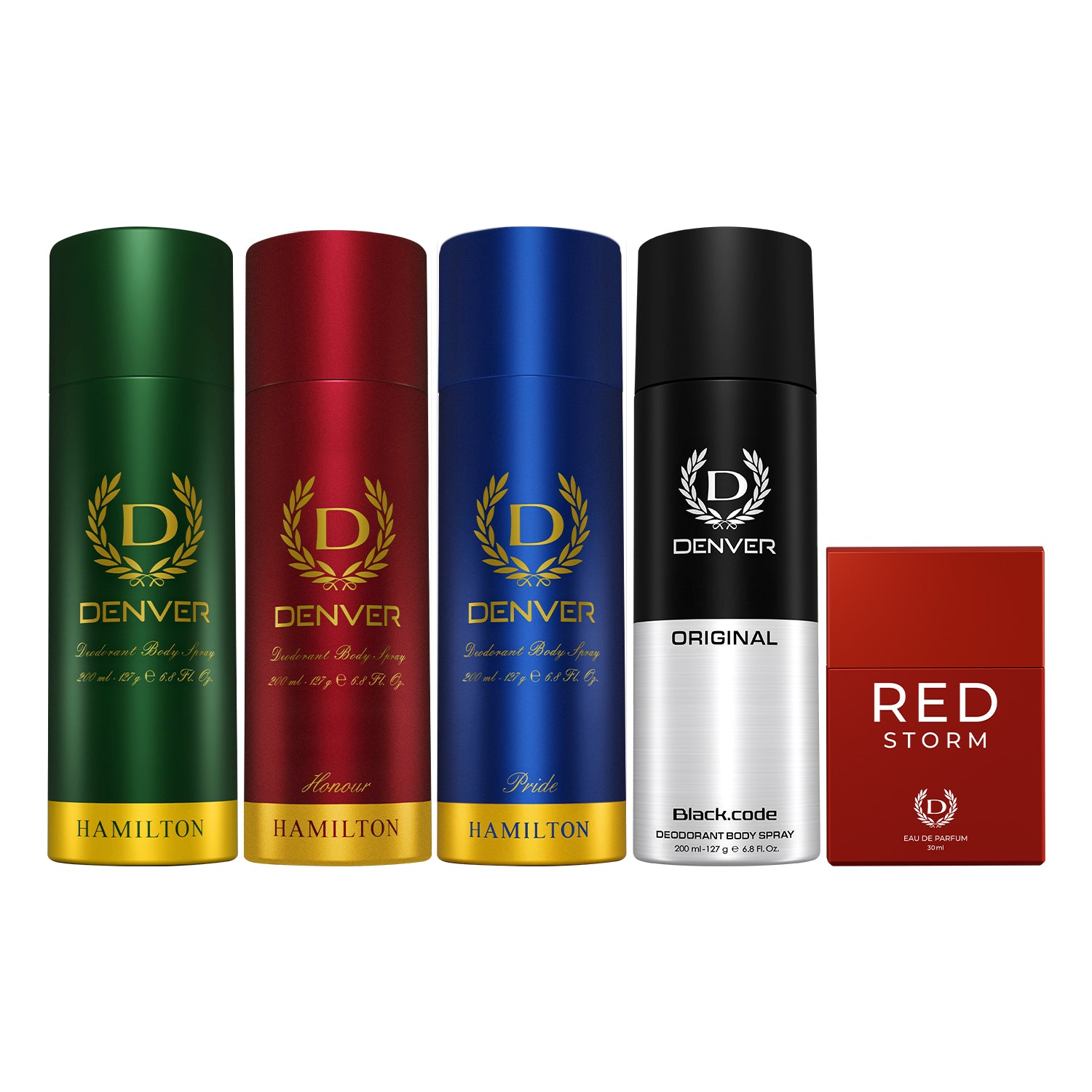Denver Pack of 5 Combo (Hamilton + Honour + Pride + Black Code Original) 200ml Deos & Red Storm 30ml Perfume