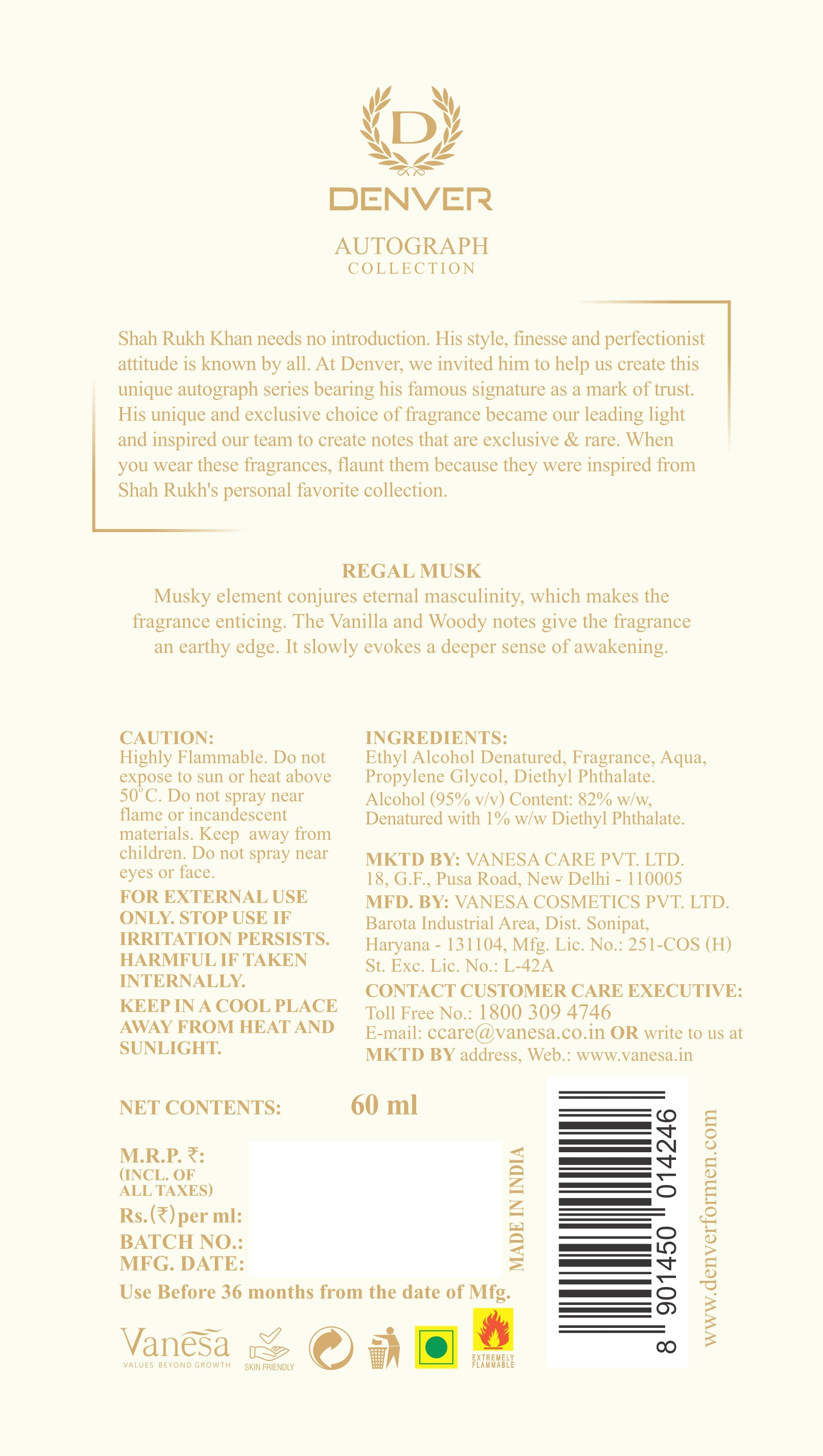 Curated by Shah Rukh Khan himself,Ā Denver Regal MuskĀ from theĀ Autograph CollectionĀ is a fragrance born from the mix of success and sensuality. Crafted with rare, French-curated ingredients, it carries the legacy of a man who redefined charmānow bottled with his signature for the man who carves his own legacy.